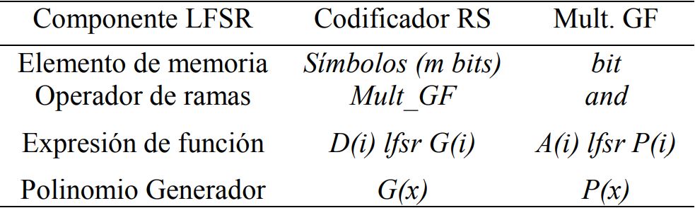 Se ha seleccionado así el caso de estudio del codificador Reed Solomon, siguiendo la tesis de modelado a partir de la estructura de registros de desplazamiento realimentados (Sandoval 2013), donde se puede observar que tanto el codificador, como el reductor modular del multiplicador en campos finitos de Galois, generan una secuencia pseudo-aleatoria, lo que es una característica de los generadores con estructura LFSR – Linear Feedback Shift Register, estos generadores están compuestos por un registro desplaza- miento y una función de realimentación.