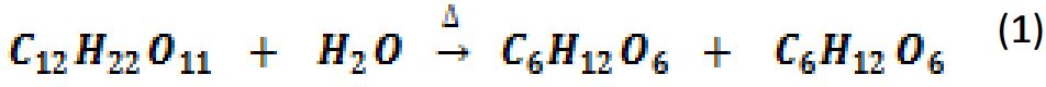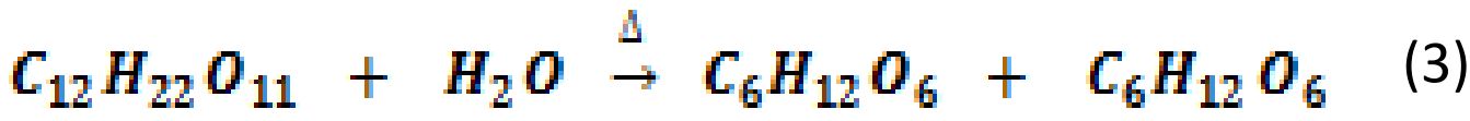 La sacarosa es un disacárido, este se hidroliza en glucosa y fructosa en presencia de H+ en solución. Estos protones son proporcionados por el ácido nítrico (ec. 1) y, al mismo tiempo el HNO3 evita la recristalización de la sacarosa.