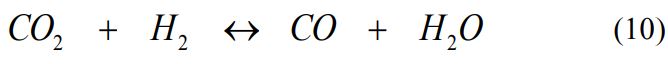 La mayor conversión de CO2 que se presenta indica que se favorece en gran medida la reacción inversa por desplazamiento de vapor de agua, aumentando la selectividad hacia la formación de CO; donde parte del hidrógeno que se produce, por la reacción de reformado seco o por el craqueo de metano reacciona con el CO2 que proviene de la corriente de alimentación (ec. 10).