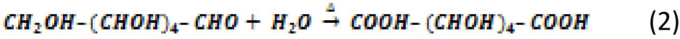 Los productos de la hidrólisis, glucosa y fructosa, se oxidan en el medio ácido (ecs. 2 y 3). El producto de la oxidación de la glucosa (aldosa) es el ácido sacárico, mientras que la fructosa (cetosa) puede oxidarse en dos tipos de ácidos hidroxílicos: ácido glicólico y trihidroxi-ácido butírico. Estos productos de la oxidación contienen grupos -COOH y grupos -OH, que formarían complejos con los cationes metálicos para evitar la precipitación.