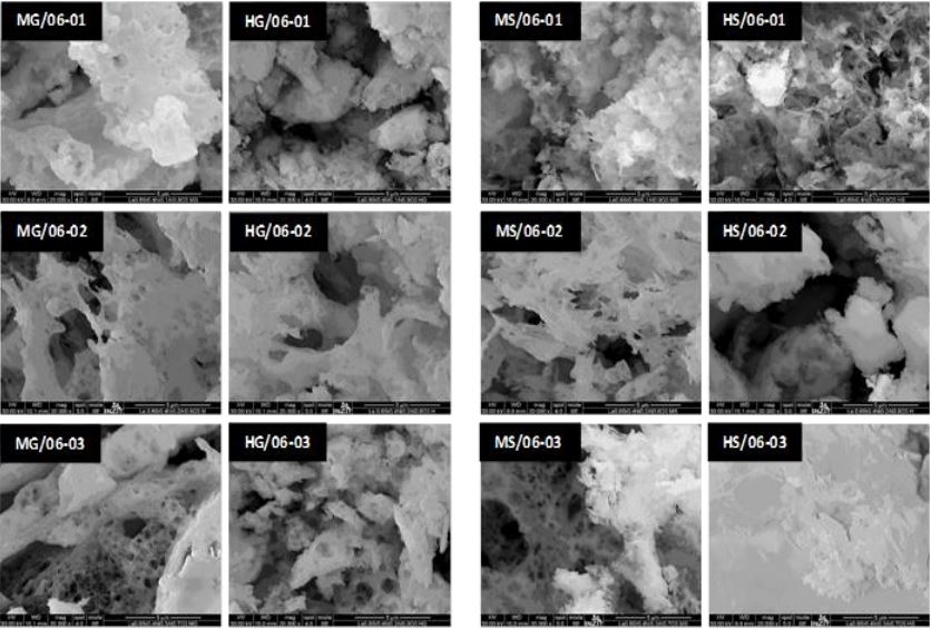 Las imágenes MEB de los sólidos sintetizados empleando glicina y sacarosa como combustibles, se muestran en la figura 1.a y 1.b respectivamente (microescala de 5μm), con el fin de estudiar la apariencia de los aglomerados de las partículas que constituyen dichos sólidos.