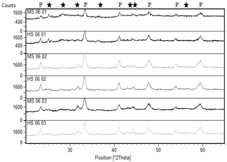 En las figuras 2 y 3 se muestran los patrones de difracción de los sólidos sintetizados empleando glicina y sacarosa, respectivamente, como carburantes. Para poder identificar por comparación las fases presentes en los sólidos se utilizó el software X'Pert Highscore Plus 2.1 el cual permitió manejar la base de datos PDF2-2004 de la ICDD.