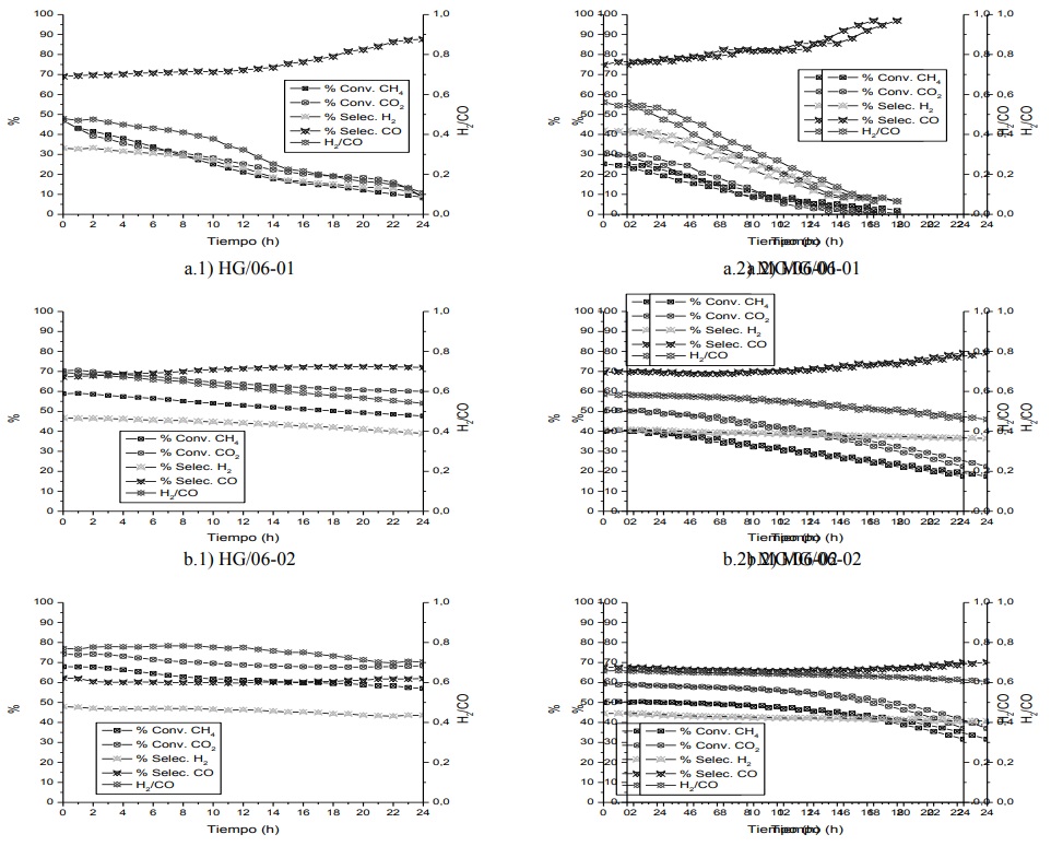 En las reacciones catalíticas se favorece la reacción inversa por desplazamiento de vapor de agua, ya que la conversión del CO2 es mayor que la conversión del metano y la relación H2/CO en promedio es ≤0,5. El catalizador más estable en esta serie es el catalizador HG/06-02, seguido de MG/06-02. Del mismo modo, que en la serie anterior la estabilidad se relaciona con los sitios de difícil reducción que tienen fuertes interacciones con la estructura (altas temperaturas).