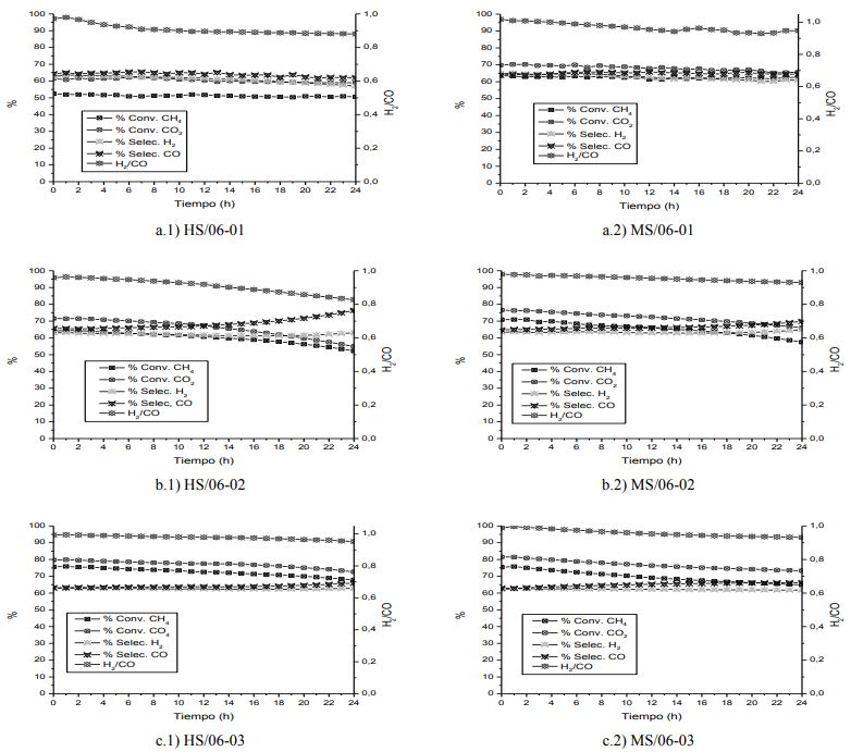 En las reacciones catalíticas se favorece la reacción inversa por desplazamiento de vapor de agua, ya que la conversión del CO2 es mayor que la conversión del metano, mientras que la relación H2/CO aunque es cercana a la unidad; tiende a disminuir, indicando que aumenta la cantidad de CO presente. El catalizador más estable en esta serie es el catalizador MS/06-02, seguido de HS/06-02. Del mismo modo, que en la serie anterior la estabilidad se relaciona con los sitios de difícil reducción que tienen fuertes interacciones con la estructura (altas temperaturas).