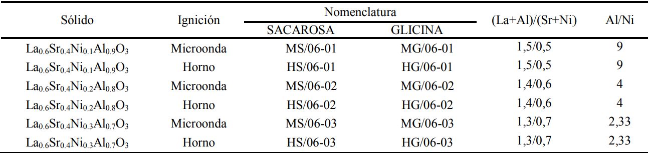 Los sólidos sintetizados por la ruta con sacarosa se describen en la tabla 1. Cuando se utiliza un valor Φ=1, se requiere una relación molar entre los nitratos trivalentes y la sacarosa de 5/16. La relación molar entre los nitratos divalentes y la sacarosa es 5/24