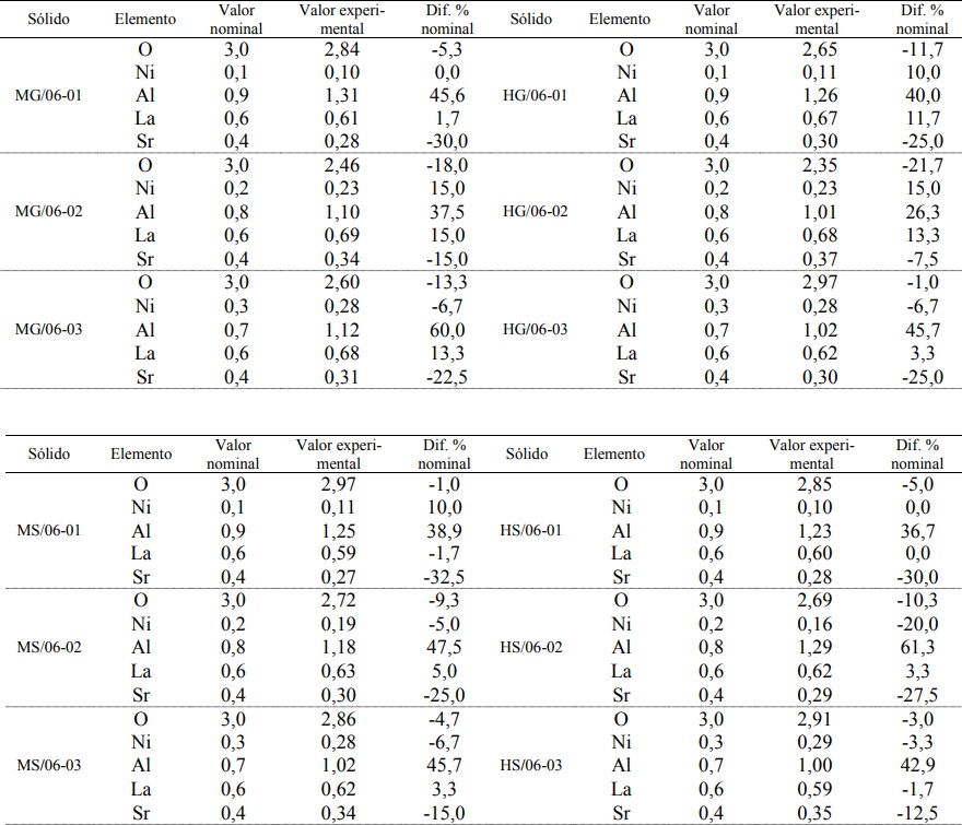 Estos valores de estequiometría se calcularon, suponiendo que los metales La, Sr, Ni, Al y el oxígeno ocupan sitios definidos en la estructura de la perovskita. En este caso la estequiometría nominal es LaxSr1-xNiyAl1- yO3, (x=0,6), (y=0,1; 0,2; 0,3).