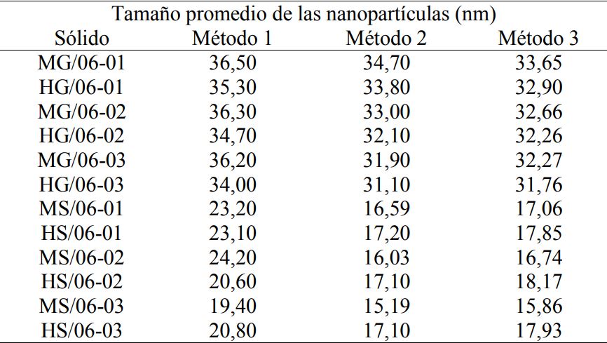 Los métodos utilizados para determinar el tamaño promedio de las nanopartículas, dependen del grado de exactitud del valor FWHM. En el método 1, la única condición es tener un pico con apariencia simétrica, pero no se eliminan los errores de fondo (corrección base, ajuste del pico, error instrumental).
