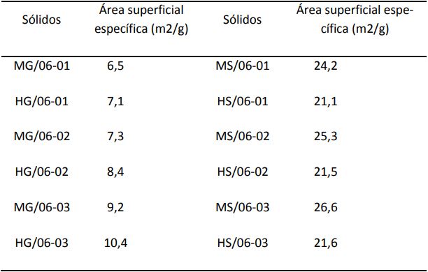 Las mediciones de área superficial específica se realizaron mediante la ecuación BET por el método de punto único (ec. 7) y una presión relativa P/P0 = 0,1 (Isernia 2000).