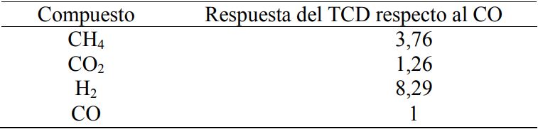 La determinación del factor de respuesta del TCD, se realizó utilizando como gas de arrastre Ar, con un flujo de 30mL/min, a través del sistema de las columnas en el cromatógrafo de gases. Este mismo gas, se utilizó como gas de referencia en el TCD con un flujo de 30mL/min. El horno del cromatógrafo de gases operó en condiciones isotérmicas (150°C). El TCD posee un factor de respuesta distinto para cada compuesto. En la tabla 5 se presentan las relaciones de los factores de respuesta respecto al CO.