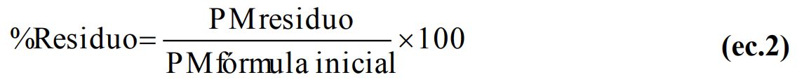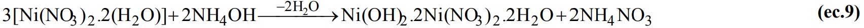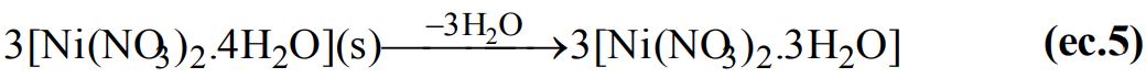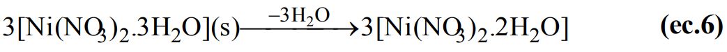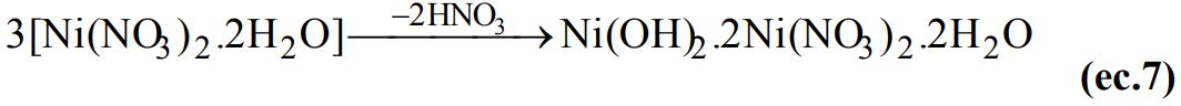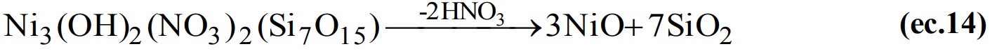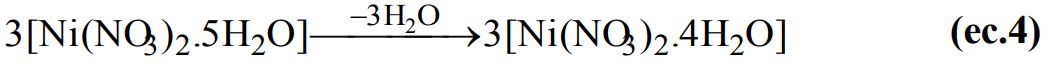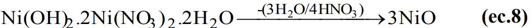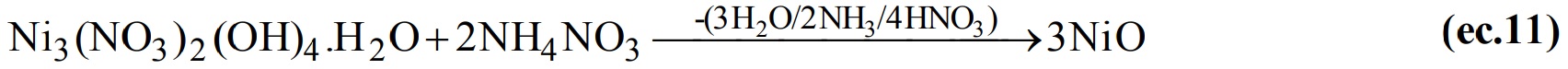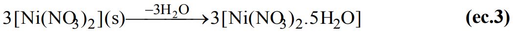 Con el porcentaje del residuo de 25,6% obtenido al final del proceso de descomposición del nitrato de níquel hexahidratado, se puede calcular el PM = 875,4 g/mol, lo que sugiere que la fórmula del compuesto de partida está compuesta por 3[Ni(NO3)2.6H2O]. Se propone la reacción de descomposición para el nitrato de níquel hexahidratado en flujo de aire: