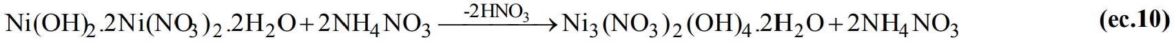 En el termograma TG-DTG del complejo de níquel formado al tratar el Ni(NO3)2.6H2O con NH4OH sin soporte, (figura 5), se observan dos pérdidas de masa en 130,5°C y 283,1°C, equivalentes al 67,4% de la masa inicial, donde la posición de los picos no corresponde con ninguno de los obtenidos para el nitrato del metal sin tratar. Con el residuo equivalente a 32,6% del compuesto de partida e identificado por DRX como NiO, se calcula el PM = 690,7 g/mol para el complejo, por lo que esté podría estar constituido por las fases Ni(OH)2.2Ni(NO3)2.2H2O y 2NH4NO3. Por lo que se propone que la formación del complejo de níquel podría ocurrir de acuerdo a la siguiente reacción