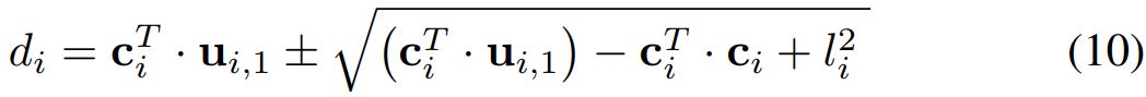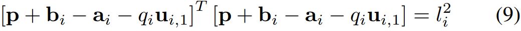 La ecuación (8) es función de: los parámetros cinemáticos, las coordenadas del elemento terminal y las coordenadas de junta. La cinemática inversa consiste en encontrar las coordenadas de junta en función de las coordenadas del elemento terminal. Los vectores ui,1 y ui,2 son función de di y θi respectivamente. Se puede eliminar la variable θi de la ecuación Eq. (8) si se despeja el termino li˙u2i hacia el lado derecho de la ecuación y se eleva al cuadrado ambos lados de la ecuación (Li y col., 2004). Así: