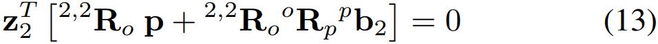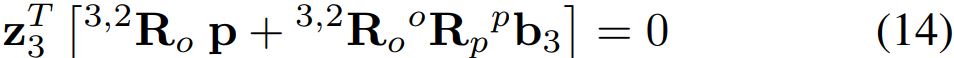 El robot paralelo estudiado presenta 3 grados de libertad, por lo que de las 6 coordenadas del elemento terminal, es necesario determinar la relación que hay entre 3 de ellas con el resto. Para ello se estudia el movimiento del centro de los pares esféricos (Bi), el cual tiene la característica de que su movimiento ocurre en el plano definido por el vector normal alineado con la dirección del eje del par de revoluta. En otras palabras, si se observa el movimiento de la pierna i respecto al sistema coordenado {Oi,2} se tiene que la componente de movimiento de la coordenada local z es igual a cero. Por tanto si determinamos la posición del punto Bi en funció del punto p y la representamos respecto al sistema {Oi,2} la tercera componente debe ser igual a cero. Esto es: