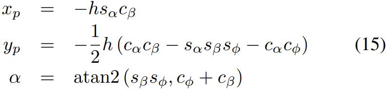 El sistema de ecuaciones (12)-(14) se puede resolver para xp, yp and α de tal manera que: