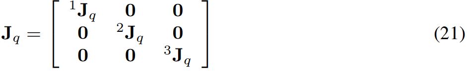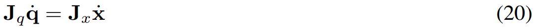 La ecuación (20) resuelve el problema de velocidad. Conocidas las coordenadas del elemento terminal, la ecuación permite determinar las velocidades de las juntas del robot. Sin embargo es necesario determinar la relación respecto a las coordenadas independientes, es decir, en función de los 3 grados de libertad. con este fin se tiene que: