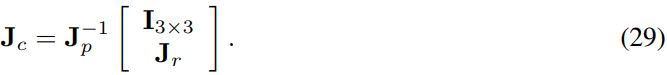 La ecuación anterior es un sistema lineal que relaciona las velocidades tanto angulares como lineales del elemento terminal. Con el objeto de obtener una matriz Jacobiana homogénea, se estudió el conjunto de coordenadas independientes que pueden ser utilizadas para resolver el sistema lineal. Del estudio se tiene que a) Las tres traslaciones pueden ser empleadas (x, y, z), b) Dos rotaciones y una traslación (α, β, z) or c) dos traslaciones y una rotación (α, x, z). Si se toma la velocidad lineal del punto p se obtiene un Jacobiano cuyas dimensiones son homogéneas. Así:
