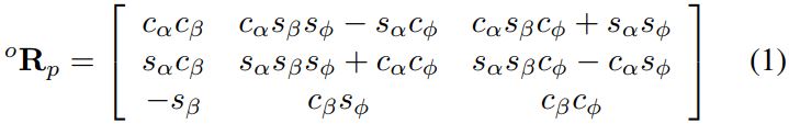 XYZ alabeo-cabeceo-guiñada (α, β, φ) del sistema {p} con respecto al sistema global de coordenadas {O}. La matriz de rotación oRp viene dada por: