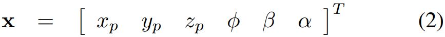Adicionalmente, para modelar las coordenadas del elemento terminal, se emplea el sistema de Angulos de Euler XYZ alabeo-cabeceo-guiñada (α, β, φ) del sistema {p} con respecto al sistema global de coordenadas {O}. La matriz de rotación oRp viene dada por: