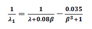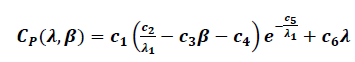 (2)Se observa en (1) que CP es función de λ y β. Puede ser calculado utilizando (3) definiendo λ1 como se muestra en (4) (Zaragozay col., 2011), donde los coeficientes c1,..,6 dependen de las características aerodinámicas de las aspas.