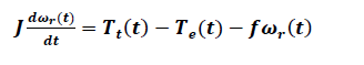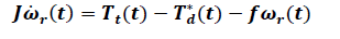 (9)Asimismo, la dinámica del eje del rotor es descrita mediante (10) (Corradini y col., 2013), donde el torque 𝑻𝒅∗ en (6) es remplazado por el torque eléctrico del motor. En este caso se asume unitaria la relación del tren de engranajes que acopla los ejes de la turbina y el generador.