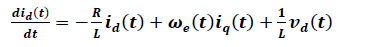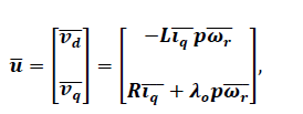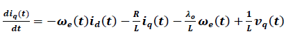 El PMSG es modelado en el marco de referencia dq0 como se muestra en (7) y (8) (Corradini y col., 2013), donde vd y vq representan las tensiones en el estator, id e iq las corrientes en el estator, R y L la resistencia e inductancia equivalentes del estator, ωe la velocidad eléctrica y λo el flujo magnético del imán permanente.