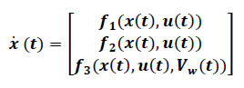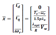 (16)donde ƒ1 y ƒ2 pueden ser determinadas directamente a partir de (7) y (8), mientras que para ƒ3 es necesario sustituir (9) y (5) en (10). Adicionalmente se toma el efecto de la velocidad del viento en ƒ3 como una perturbación. Se asume como condiciones iniciales x(to) y la salida del sistema viene dada por y(t) (velocidad angular del eje).