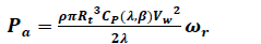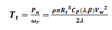 La extracción de potencia mecánica del viento capturada por la turbina eólica de eje horizontal viene dada por (1) (Munteanu y col., 2010, Bianchi y col., 2007), donde ρ representa la densidad del aire, 𝑹𝒕 la longitud del aspa, ωr la velocidad angular del rotor, β el ángulo de inclinación de las aspas, CP la eficiencia de la turbina para la conversión de energía eólica a energía mecánica y λ la relación de veloci-dad de punta, la cual es la relación entre la velocidad lineal en la punta del aspa y la velocidad del viento como se muestra en (2) (Munteanu y col., 2010, Bianchi y col., 2007).