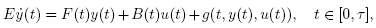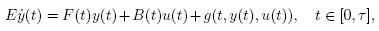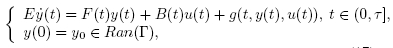 En el estudio de la controlabilidad para tales sistemas, muchos resultados pueden ser evaluados en (Mehrmann y col., 2006, Berger y col., 2009). En general, los resultados allí mostrados son referidos a sistemas descriptores lineales como (1). Por el contrario, en este artículo se aplica el Teorema de punto fijo de Rothe para probar la controlabilidad del siguiente Sistema Descriptor Semilineal no autónomo de ecuaciones diferenciales ordinarias