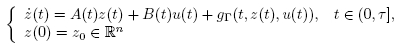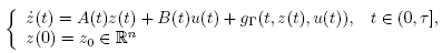 A diferencia de los sistemas lineales, la bibliografía no es muy amplia cuando se trata de sistemas semilineales no autónomos, en este sentido se puede mencionar el trabajo realizado por Lukes en (Lukes 1973), donde probó que, si el sistema lineal (11) es controlable, entonces el sistema no lineal (sistema perturbado) es también controlable, probando que la función no lineal gr es acotada. En (Leiva 2014) se prueba la controlabilidad del sistema semilineal no autónomo (3), usando la acotación (4) de la función no lineal gr y asumiendo la controlabilidad de la ecuación (11). El resultado de Lukes aparece en un contexto más general en (Coron 2007) (ver Teorema 3.40 y 3.41 Corolario de (Coron 2007)), pero el término no lineal sigue dependiendo sólo de las variables (t; z). En (Vidyasager 1972) se presenta el caso cuando la función gr no depende del parámetro