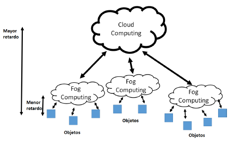 Otra posibilidad consiste en la infraestructura denominada fog computing que consiste en el uso de servidores ubicados los más cerca posible al sitio donde se encuentran instalados los sensores y actuadores, al contrario de lo que sucede con la conocida como cloud computing. Esta misma solución permite manejar el problema de la escalabilidad cuando se incrementa el número de dispositivos conectados (ver Figura 3). Algunos autores consideran que como consecuencia de estas nuevas arquitecturas, ya sea cloud o fog, el modelo piramidal clásico se ha difuminado dando paso al concepto de automatización como servicio (Hegazy, 2015).