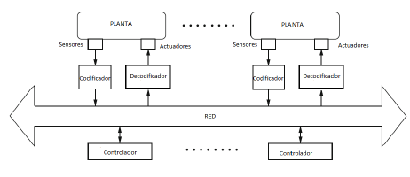 La arquitectura básica de un SCBR se muestra en la Figura 4. En la misma es posible apreciar la presencia de codificadores y decodificadores, los cuales sirven de interfaz entre el proceso controlado y el sistema de control. Comúnmente estas funciones pueden ser realizadas por un mismo equipo denominado "gateway".