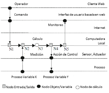 En (Cardwell y col., 2000) se ilustra el funcionamiento del SCBI mediante un diagrama de eventos de control de procesos como el que se muestra en la Figura 8. El modelo propuesto por estos autores está constituido por seis capas denominadas: Operador, Interfaz Web de Usuario, Internet, Computador Local, Sensores/Actuadores y Proceso. Note que otros autores prefieren diferentes nomenclaturas (Voas, 2016).
