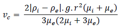 donde 𝜌𝑖 y 𝜇𝑖 son la densidad y viscosidad del líquido que constituye la gota. Para el caso en que 𝜇𝑖 ≪ 𝜇𝑒, la velocidad 𝑣𝑐 resulta un 50%, mayor que la predicha por la Ley de Stokes; mientras que, para 𝜇𝑖 ≫ 𝜇𝑒, 𝑣𝑐 se aproxima a aquella predicha por la Ley de Stokes.