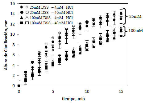 De la tabla de efectos, y del análisis de varianza, sólo la concentración de surfactante resultó tener efecto sobre la velocidad de clarificación. Esto también se puede apreciar en la figura 1, a mayor concentración, la velocidad de clarificación es menor en cualquier instante de tiempo, sin importar la concentración de HCl o la presencia de partículas de sílice.