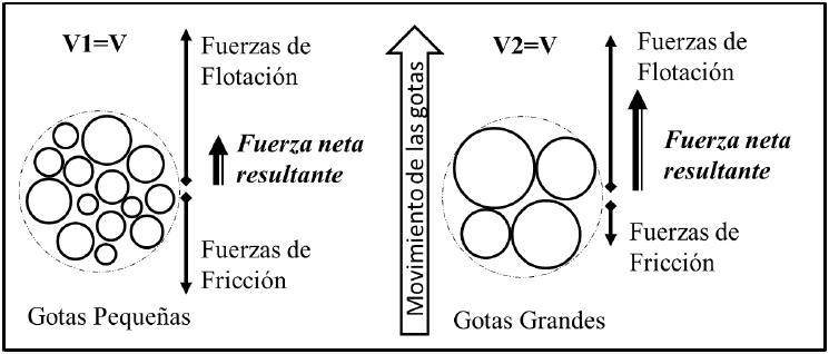 Con la idea de dar una explicación desde el punto de vista microscópico a estos resultados y proponer un mecanismo para el fenómeno de la transferencia de masas, se midieron los tamaños de gotas de distintas emulsiones a los dos niveles de concentración de surfactante, observándose en todos los casos que el tamaño de gota es siempre menor a mayor concentración, 100mM. Para un mismo volumen de gotas, tanto la fuerza como la aceleración de la gravedad son las mismas, sin importar su tamaño; en cambio las fuerzas de fricción que se dan a nivel de la superficie de las gotas son altamente dependientes del área superficial de las mismas, la cual para un mismo volumen de gotas se ve incrementada considerablemente con la disminución de su tamaño. Esto se muestra en el bosquejo presentado en la figura 5. La fuerza neta de flotación, resultante de la gravedad y la diferencia de densidades, es la misma en ambos conjuntos de gotas, mientras que la fuerza superficial (resultante de las fuerzas de fricción viscosas, sobre las superficies de las gotas, que ofrecen una resistencia al movimiento de las mismas) es mucho mayor para las gotas más pequeñas, debido a que tiene mucho más área; consecuentemente, la resultante de fuerza es menor para el conjunto de gotas pequeñas que para el de las grandes.