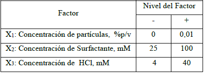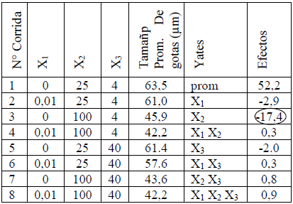 Se emplea un programa experimental fundamentado en un diseño factorial 23 aplicado con el fin de evaluar simultáneamente el efecto de los factores, concentración de surfactante, presencia de partículas de sílice y concentración de HCl sobre la primera etapa de vida de una emulsión o/w, la velocidad de clarificación de la fase externa (acuosa); esto es, la velocidad con que el líquido intergotas se drena. Todas las emulsiones se formaron a una relación agua/aceite, WOR, igual a 1, con un volumen total de 6ml, agregando consecutivamente en un tubo de ensayo solución surfactante, agua, suspensión de partículas de sílice (en los experimentos en los que requiriese), y parafina. Luego, se agita durante cinco minutos a 14000 rpm; se adiciona HCl en los casos que lo amerite de acuerdo al diseño experimental, y se agita nuevamente durante un minuto. Todos los factores se variaron a dos niveles: la concentración de surfactante a 25y 100mM, la de HCl a 4 y 40mM, y la de sílice a 0.00 y 0.01%p/v, lo cual resulta en ocho tratamientos posibles (ocho conjunto de condiciones experimentales o de operación), a dos réplicas, para un total de 16 corridas experimentales (ver tablas 1 y 2). Este tipo de diseño permite evaluar, no sólo el efecto de los tres factores sino también el de sus interacciones, todo a la vez. Para cumplir con el principio estadístico crítico de la independencia de las observaciones, se aleatoriza el orden en que se ejecutan las distintas corridas experimentales a modo de eliminar errores de naturaleza sistemática, dejando sólo el “ruido”, natural; esto se hace mediante una rutina del software Microsoft® Excel. Se ejecutan en dicho orden las distintas corridas experimentales, y los resultados de altura de clarificación, para un valor de tiempo determinado, se organizan tal como muestra la tabla 2; a estos datos se aplica el algoritmo de Yates (Montgomery 2001) para estimar los efectos de los distintos factores y el de las interacciones entre ellos. El análisis de varianza (ANOVA), por otra parte, dice cuáles de los efectos, si los hay, son diferentes de cero, mediante un criterio de significancia estadística.