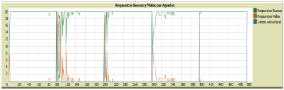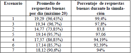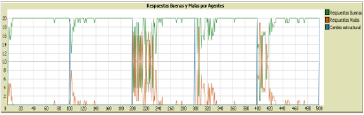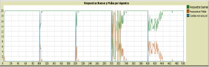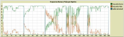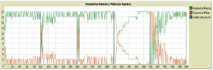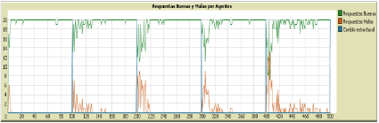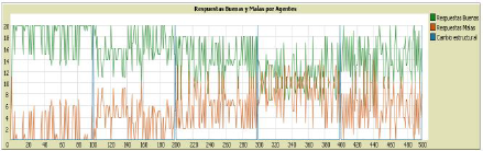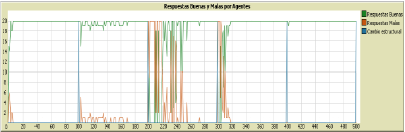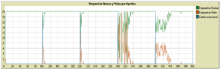 A fin de analizar el comportamiento organizacional, en esta sección se presenta para el experimento diseñado: a) gráficos que muestran el número de respuestas buenas (línea de color verde) y malas (línea de color rojo) de cada agente en cada día de simulación (ver figuras 3,4,5,6,7,8,9,10,11,12,13,14,15,16,17,18,19), y b) tablas (Tablas 2,3,4) que indican: i) los resultados de Promedio de agentes que dieron respuestas buenas por día durante toda la simulación (recordemos que el número total de agentes es 20), así como el porcentaje correspondiente; y, ii) el porcentaje de respuestas buenas durante la simulación.