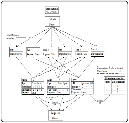 Según la actitud del agente, o grado de compromiso y colaboración con la organización, el agente envía ítems al sistema de recomendación de diversa forma: b.1) agente bueno o colaborador, el cual está comprometido con la organización, y por tanto envía al sistema de recomendación el ítem mejor endosado; b.2) agente regular, descuidado, o mediocre, quien tiene un nivel medio de compromiso organizacional y recomienda aleatoriamente cualquiera de los ítems que posee; y, b.3) agente mal intencionado o viciado, o agente con un nivel de compromiso organizacional negativo, quien recomienda el ítem con el peor valor de endoso.