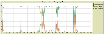 Efectivamente, se observa que los agentes comprometidos tienen efecto muy positivo en el comportamiento organizacional, mucho mejor que las consecuencias de las decisiones de los agentes mediocres, quienes, a su vez, generan rendimiento menos dañino que el de los agentes viciados. Los agentes colaboradores son esenciales para lograr la adaptación, y el buen rendimiento, de la organización, incluso en cuanto al tiempo requerido para alcanzar la estabilización de la organización, cuando comparten con agentes mediocres o con agentes viciados (el comportamiento mostrado en las figuras 14 y 15, con solo agentes mediocres o viciados, mejora significativamente al ser combinados con agentes de aprendizaje, como lo muestran las figuras 16 y 17).