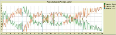 Un sistema/modelo sufre cambio estructural cuando sus propiedades cambian, o cuando aparecen o son eliminados algunos de sus componentes. En el modelo presentado en este trabajo, el cambio estructural ocurre en primera instancia en los ítems que permiten a la organización observar el entorno, al variar su probabilidad de error. Esta variación va a ser introducida varias veces para cada experimento de simulación, generándose un período entre cada dos cambios estructurales en los que la organización se auto-organiza, antes de sufrir de nuevo un cambio estructural. Los resultados de la simulación toman en cuenta estos varios períodos, que conforman una suerte de réplicas de períodos de auto- organización entre cada par de cambios estructurales (un período = una réplica). Sin embargo, en este trabajo no se toman como replicas, por su reducido número (5), sino que se consideran como una totalidad, al involucrar un número elevado de experiencias de los agentes, y permitir la convergencia de la simulación en cada uno de los períodos