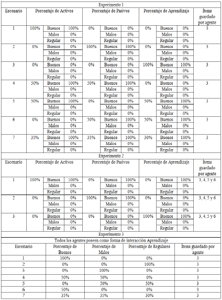 Se hace un diseño de experimentos a fin de determinar la influencia de algunos factores, especialmente de las diversas características de los agentes, en el rendimiento organizacional. A cada configuración de los parámetros se le llama escenario. Se diseñaron tres experimentos (ver Tabla 1):