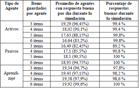 Las figuras 11 y 12 indican que el aumento de la capacidad de memoria en los agentes del tipo pasivo y de los agentes de tipo aprendizaje incrementa el promedio de agentes con respuesta buena por día, así como el porcentaje de respuestas buenas de la organización durante la simulación. Sorprendentemente, en caso de los agentes del tipo activo no ocurre el mismo efecto (ver el incremento de la inestabilidad en el rendimiento organizacional en la Fig. 10), pues conforme aumenta la cantidad de ítems guardados, disminuye el valor del promedio de respuestas buenas por día (ver Tabla 3).