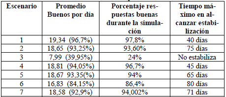 En las figuras 3,4,5,6,7,8,9 se puede apreciar que la capacidad, en términos de rapidez, de estabilización después de un cambio estructural, así como la forma como se da la estabilidad (constante u oscilante), es diferente para cada escenario. Es decir, la estabilidad alcanzada depende del factor variado: porcentaje de tipos de agente; lo que indica que la forma en la que los agentes interactúan genera comportamientos organizacionales diferentes para cada caso. Los agentes del tipo aprendizaje y de tipo activo generan el mejor rendimiento, al lograr estabilidad constante (ver Figuras 3, 5, y 7; y Tabla 3).
