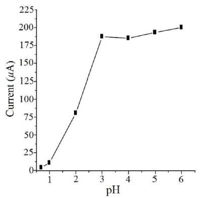 The anodic current dependence with pre-concentration time was studied for 1 x 10-6 and 1 x 10-7 mol L-1 Pb(II) concentrations, from 0 to 12 min. range. The current reaches an optimum value in 5 min., being constant thereafter; this suggests that the Pb(II) ion reaches equilibrium with the coordination sites of the chemical modifier. The effect of carbon paste composition on the pre-concentration was tested. The CMEs prepared from 0, 3.5, 7, 11, and 15 % weight-to- weight ratio (w/w) LNS - carbon paste were examined under the same conditions by differential pulse voltammetry in the -800 to 0 mV range, KCl 0.1 mol L-1 / HClO4 0.01 mol L-1 as supporting electrolyte and 5 min. accumulation time. It shows a gradual increase with a current maximum for a 7 % ratio, indicating that the modifier accumulated lead ions from the solution into the electrode surface. After this maximum, the current decreases with LNS % increases suggesting that the modifier increases the resistance of the graphite phase.