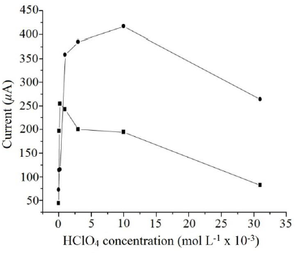 The HClO4 concentration effect on the oxidation current is shown in Fig. 3. A maximum in the anodic current was observed at HClO4 concentrations of 1 x 10-2 mol L-1 for the KCl/ HClO4 electrolyte. The current values are smaller with NaNO3/HClO4 as supporting electrolyte. This indicates that the KCl/HClO4 supporting electrolyte possibly stabilizes better the [(LNS)Pb] complexes or intermediates formed on the electrode surface, since the Cl- ion is a good ligand for lead and could complete the coordination sphere of the metal ion. In both cases there is a gradual decrease with increasing HClO4 concentration, probably due to the pH effect. (Fig. 3).