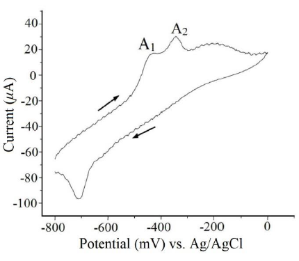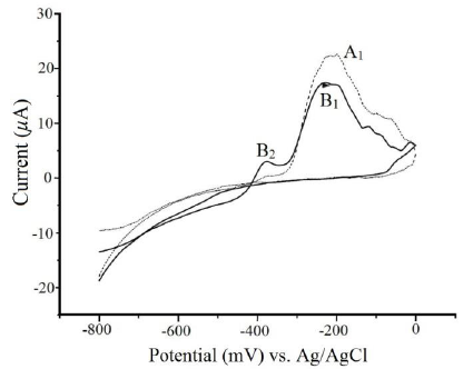 The electrochemical behavior for Pb(II) 1 x 10-2 mol L- 1 on carbon paste electrode without modifier, in KCl/HClO4 is shown in Fig. 4. The cyclic voltammogram shows three processes: first, an anodic peak (A1) at -440 mV; second, an anodic peak (A2) at -356 mV and third, a reduction peak at - 560 mV. A4