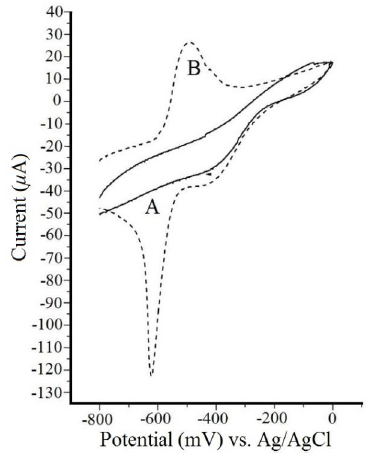 Electrochemical behavior of lead(II) on the chemically modified carbon paste electrodes Cyclic voltammetry of the CME in KCl 0.1 mol L-1 as supporting electrolyte is shown in Fig. 5. The voltammogram corresponding to the modifier chemical agent LNS (A) indicates no electroactivity in this potential range. The voltammogram for Pb (II) 1 x 10-2 mol L-1 (B) shows an anodic peak at -440 mV and a cathodic peak at -660 mV, both irreversible systems. Compared with the unmodified CPE shown in Fig. 4, there is a noticeable enhancement of Pb (II) response for the same ion concentration on the CME (Fig. 5).