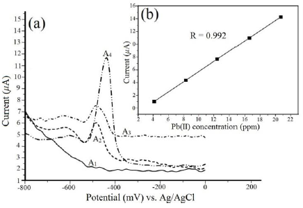 The fresh surface was activated through 15 cycles in the -800 to 0 mV range and 150 mVs-1 scan rate. Lead (II) pre- concentration was done by first washing the electrode surface with Millipore 18 MΩ.cm water and then introducing in the corresponding lead (II) acetate solution with adjusted pH, and stirring for 5 min. The general parameters for cyclic voltammetry were: 40 mVs-1 and -800 to 0 mV scan range. The electrode surface was regenerated applying the same conditions of preconditioning. The general parameters for differential pulse voltammetry were: 8 mVs-1, 75 mV pulse height, 0.5 s pulse width; and -800 to 0 mV scan range; the solution was deoxygenated by N2 bubbling for 5 min.
