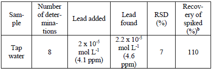 The determination of lead(II) was then carried out in tap water, however, as expected, this method is not sensitive enough to determine the concentration of lead(II) at this level, which has been quoted to be extremely low: 0.042 ± 0.001 ppm, determined by inductively coupled plasma atomic emission spectrometry (ICP-AES). Hence, the determination was carried out in “spiked” tap water with a VAR- IAN lead standard solution. The analysis results are shown in Table 1.
