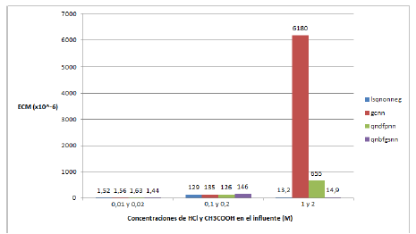 Según el análisis de la varianza no existe para los dos primeros casos una diferencia significativa entre las medias de los errores cometidos por cada método; mientras que para las concentraciones de 1 M y 2 M de los ácidos presentes en el influente, clorhídrico y acético, respectivamente, ese mismo análisis arroja como resultado un error de aproximación significativamente diferente para gcnn con respecto a los demás métodos.